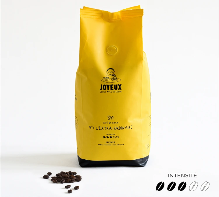 Café Joyeux ce n’est pas que des restaurants c’est aussi une gamme de cafés en grain, moulus et des capsules. Depuis novembre 2018, les Café Joyeux ont mis en place une activité de sélection, torréfaction et distribution d’un café solidaire.